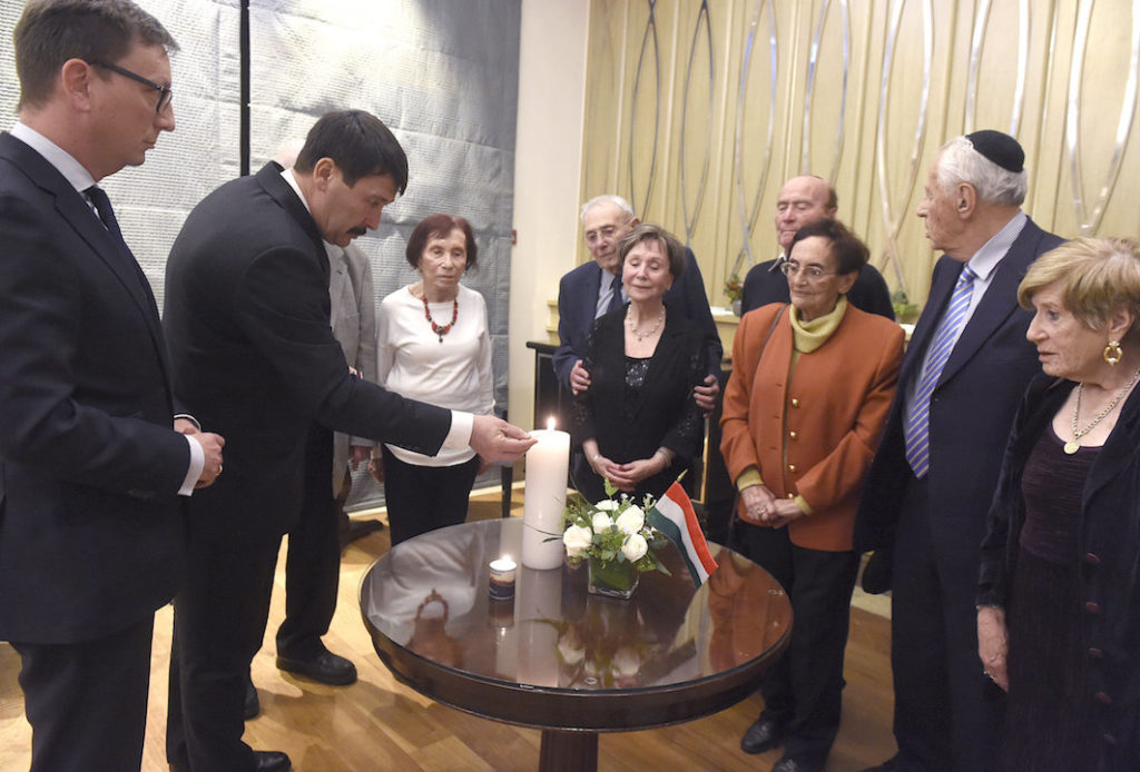 Áder János köztársasági elnök magyar származású holokauszttúlélők körében meggyújtja az emlékezés gyertyáját Auschwitz felszabadulásának 75. évfordulója alkalmából Jeruzsálemben 2020. január 23.-án. Az államfő mellett balra Benkő Levente nagykövet.