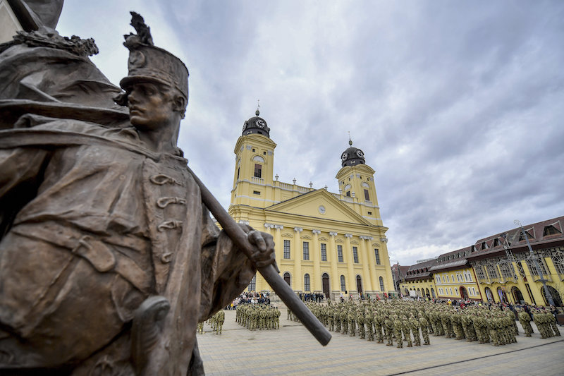 A Koszovóba induló, a Magyar Honvédség KFOR (Kosovo Force) Kontingens 22. váltásának kibocsátó ünnepsége a debreceni Kossuth téren 2020. február 11-én.