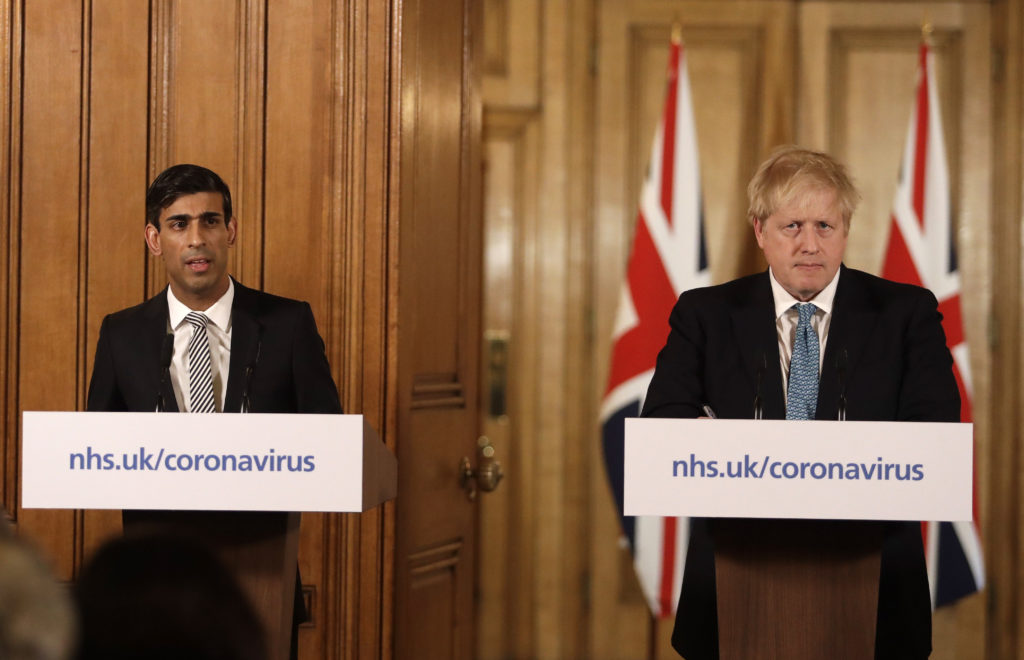 London, 2020. március 17. Boris Johnson brit miniszterelnök (j) és Rishi Sunak brit pénzügyminiszter sajtóértekezletet tart a koronavírus helyzetérõl a londoni kormányfõi rezidencián, a Downing Street 10-ben 2020. március 17-én. Sunak bejelentette, hogy a brit kormány 330 milliárd font (126 ezer milliárd forint) értékû pénzügyi segítséget nyújt az új típusú koronavírus okozta járvány miatt bajba került üzleti vállalkozásoknak, mindenekelõtt hitelgaranciák formájában. MTI/EPA/Pool/Matt Dunham
