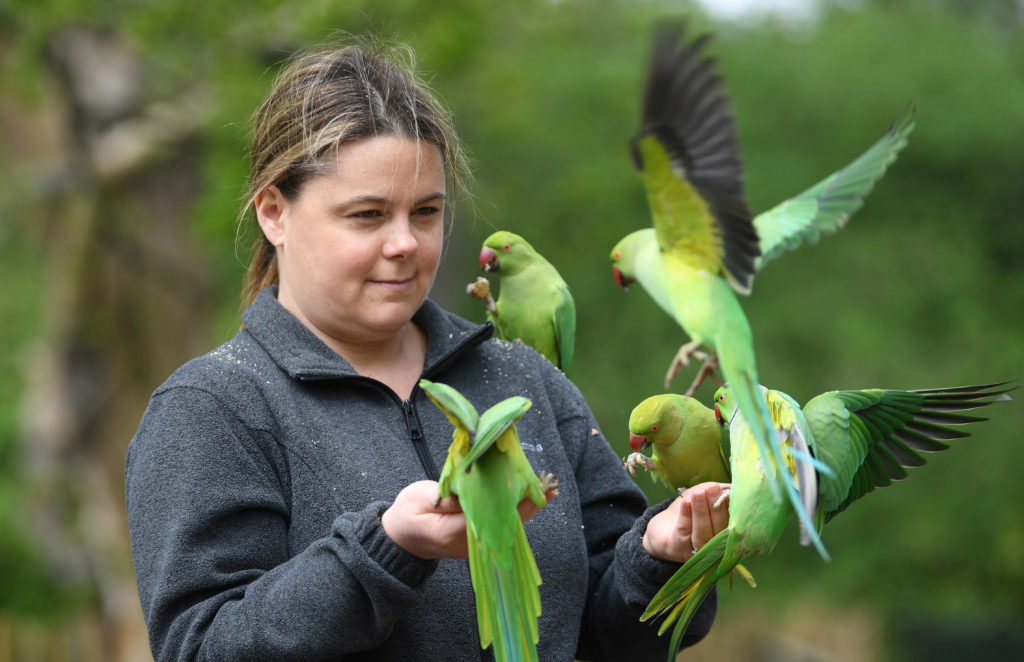 KL/MTI – Kiemelt képen: Arapapagájokat etet egy nő a londoni Kensington Gardensben 2020. április 18-án, a koronavírus-járvány idején. A vadon élő állatok egyre biztonságosabban érzik magukat az elcsöndesedett, kiürült városok utcáin, terein és parkjaiban. – EPA/Neil Hall